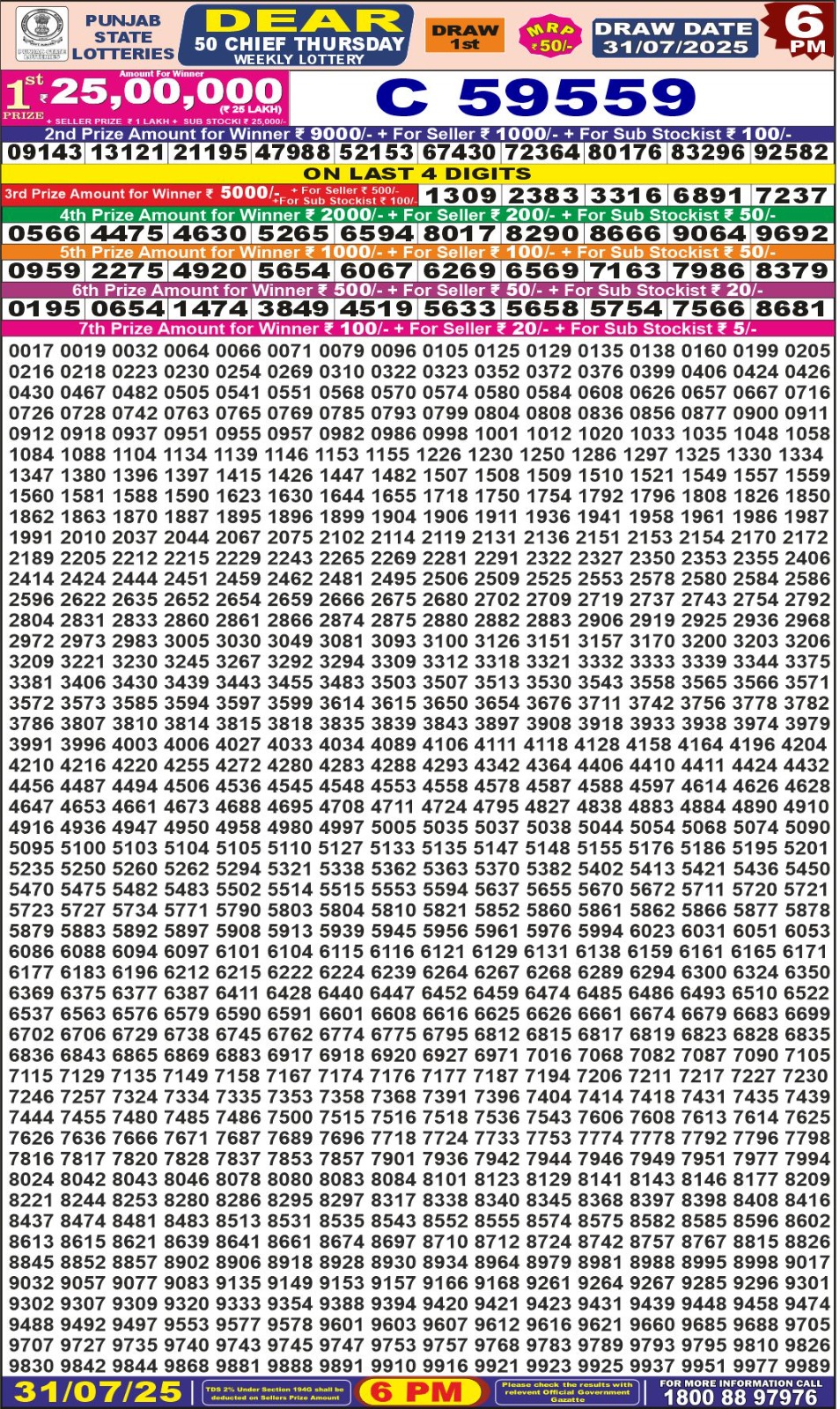 Punjab State Dear 50 chief Thursday Weekly Lottery 6 PM Result 31-07-25