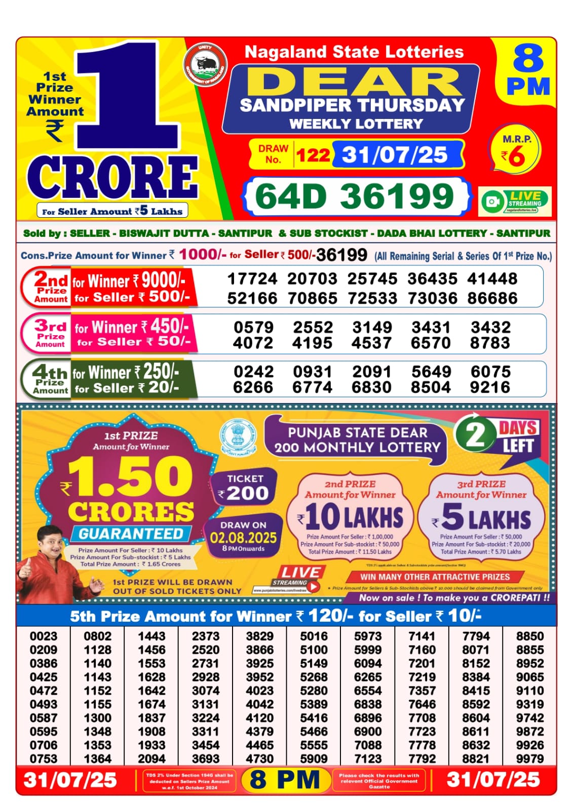 Dear Sandpiper Thursday Weekly Lottery 8 PM Result 31-07-25