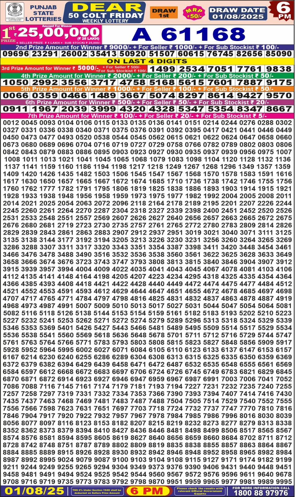 Punjab State Dear 50 colt Friday Weekly Lottery 6 PM Result 01-08-25