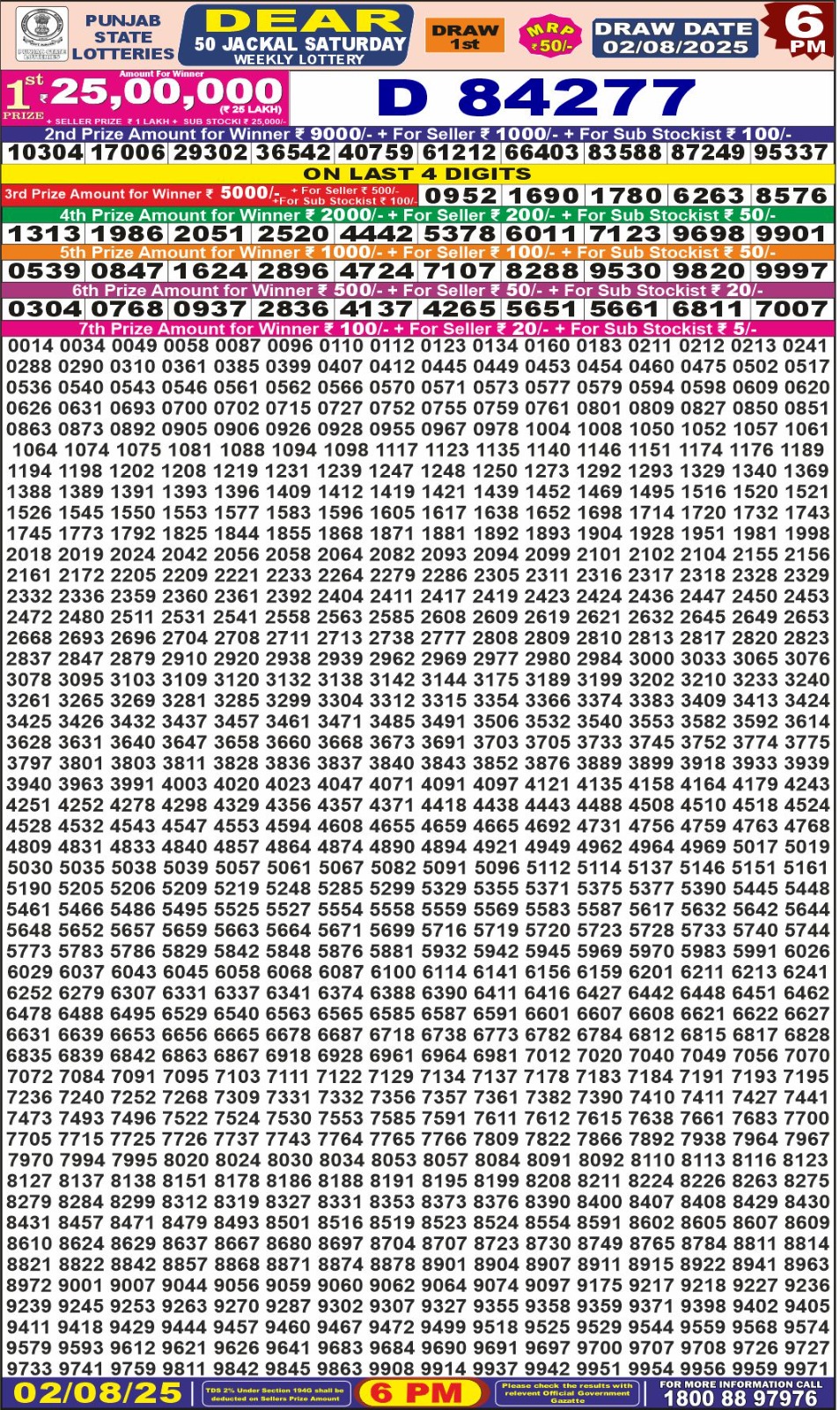 Punjab State Dear 50 Jackal Saturday Weekly Lottery 6 PM Result 02-08-25