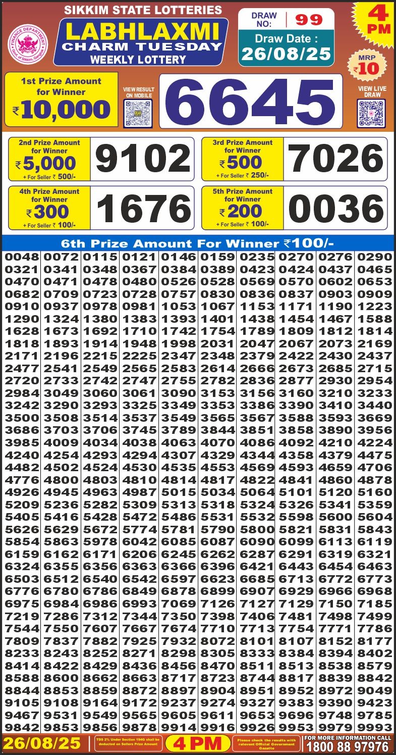 Labh Laxmi Charm Tuesday Weekly Lottery 4 PM Result 26-08-25