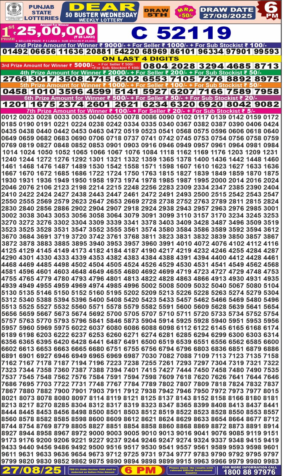 Punjab State Dear 50 Buster Wednesday Weekly Lottery 6 PM Result 27-08-25