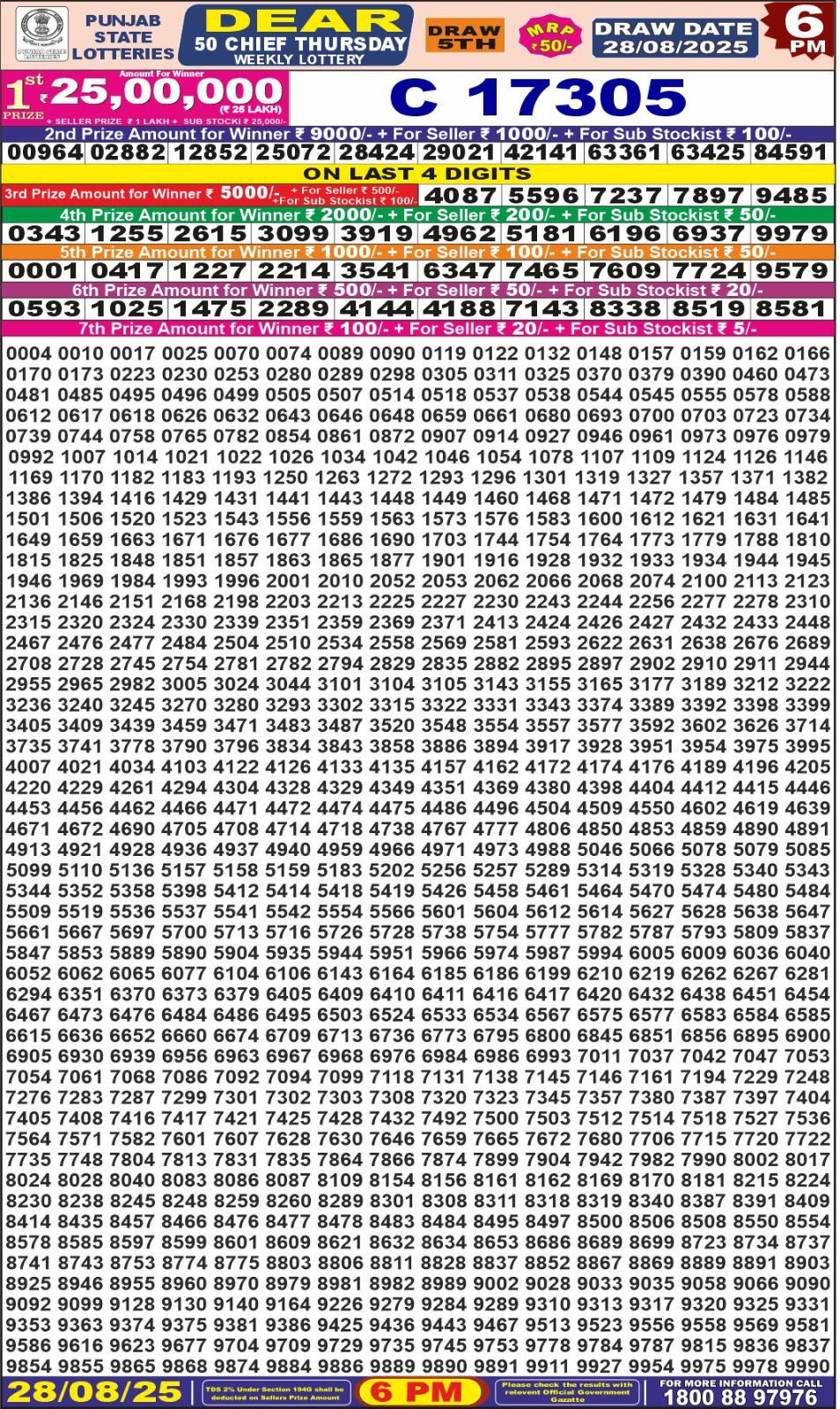 Punjab State Dear 50 chief Thursday Weekly Lottery 6 PM Result 28-08-25