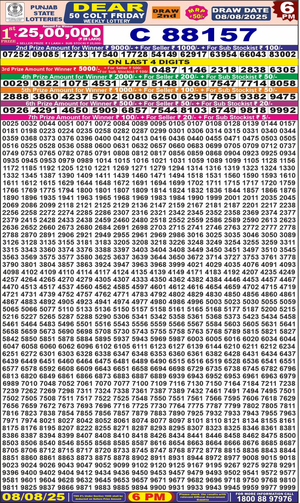 Punjab State Dear 50 colt Friday Weekly Lottery 6 PM Result 08-08-25