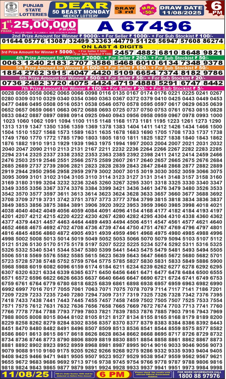 Punjab State Dear 50 Beast Monday Weekly Lottery 11-08-25