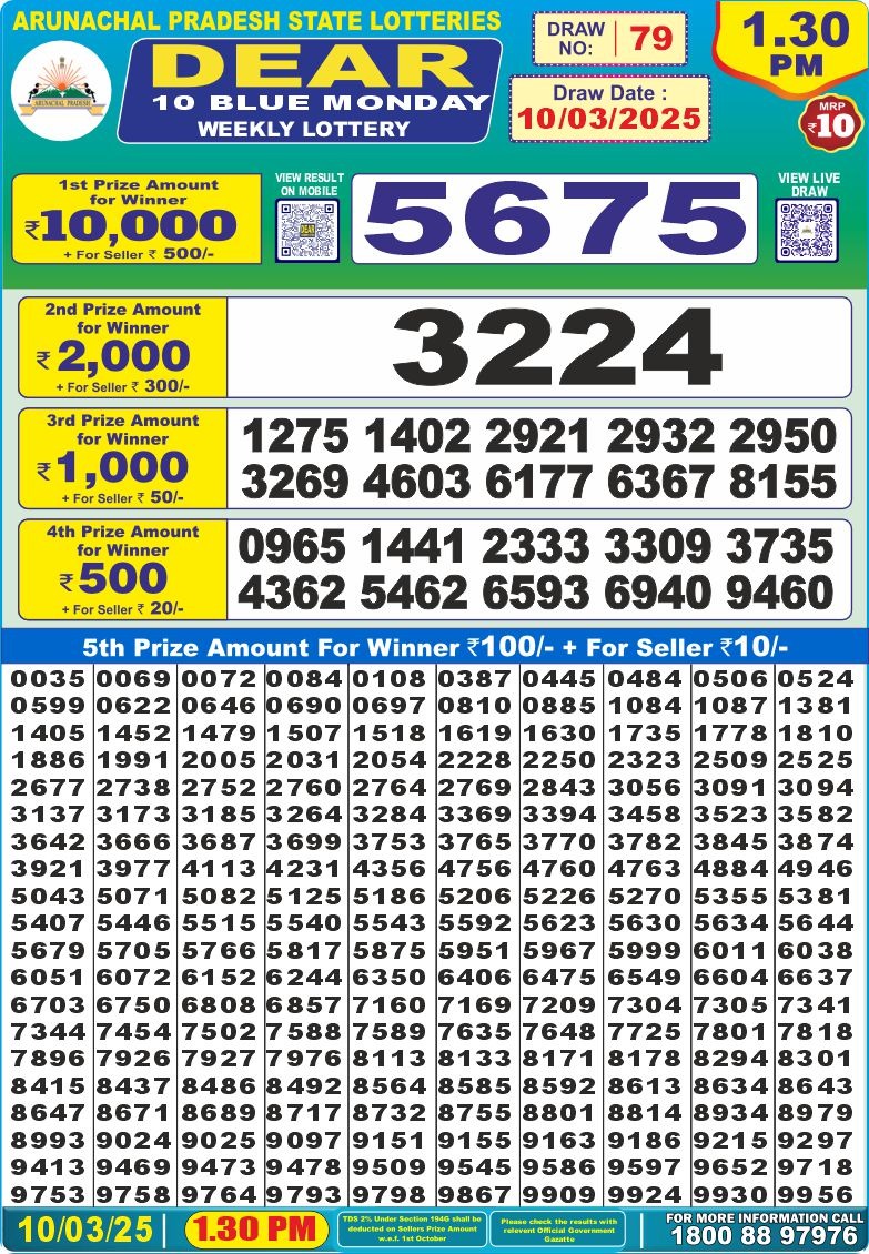 Dear 10 blue monday weekly lottery 1:30 pm result 3-3-25