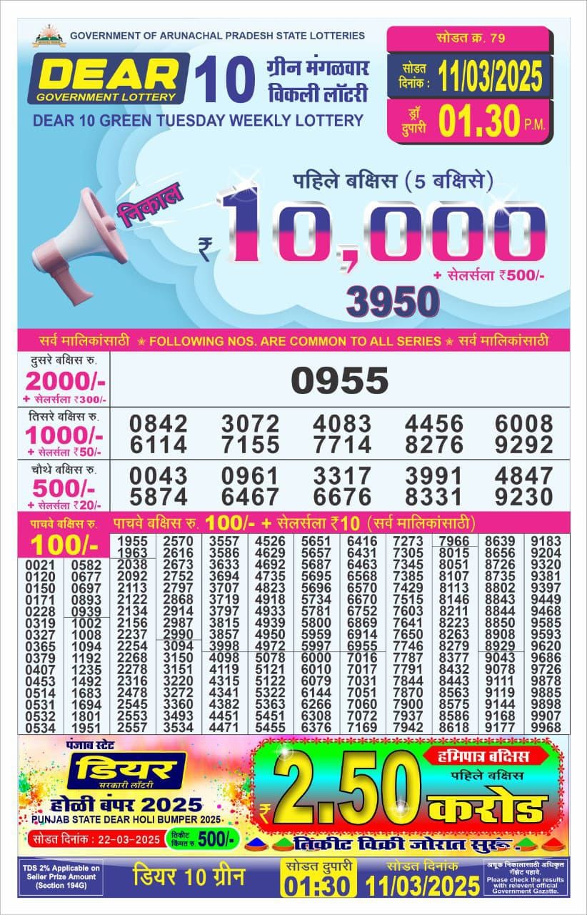 Dear 10 green tuesday weekly lottery 1:30 pm result 11-3-25