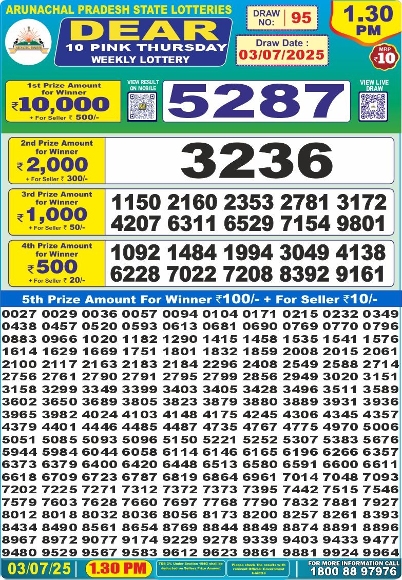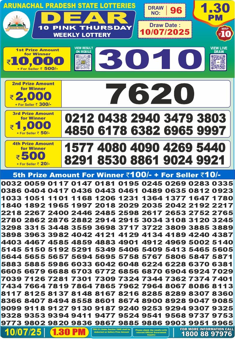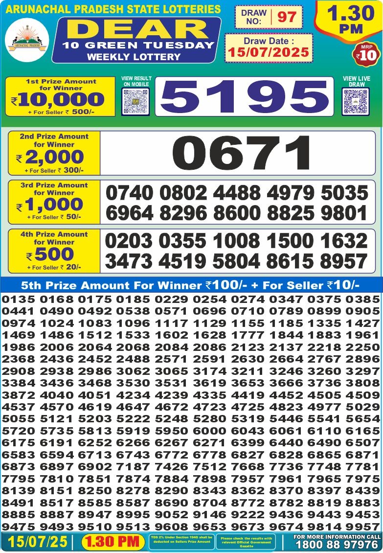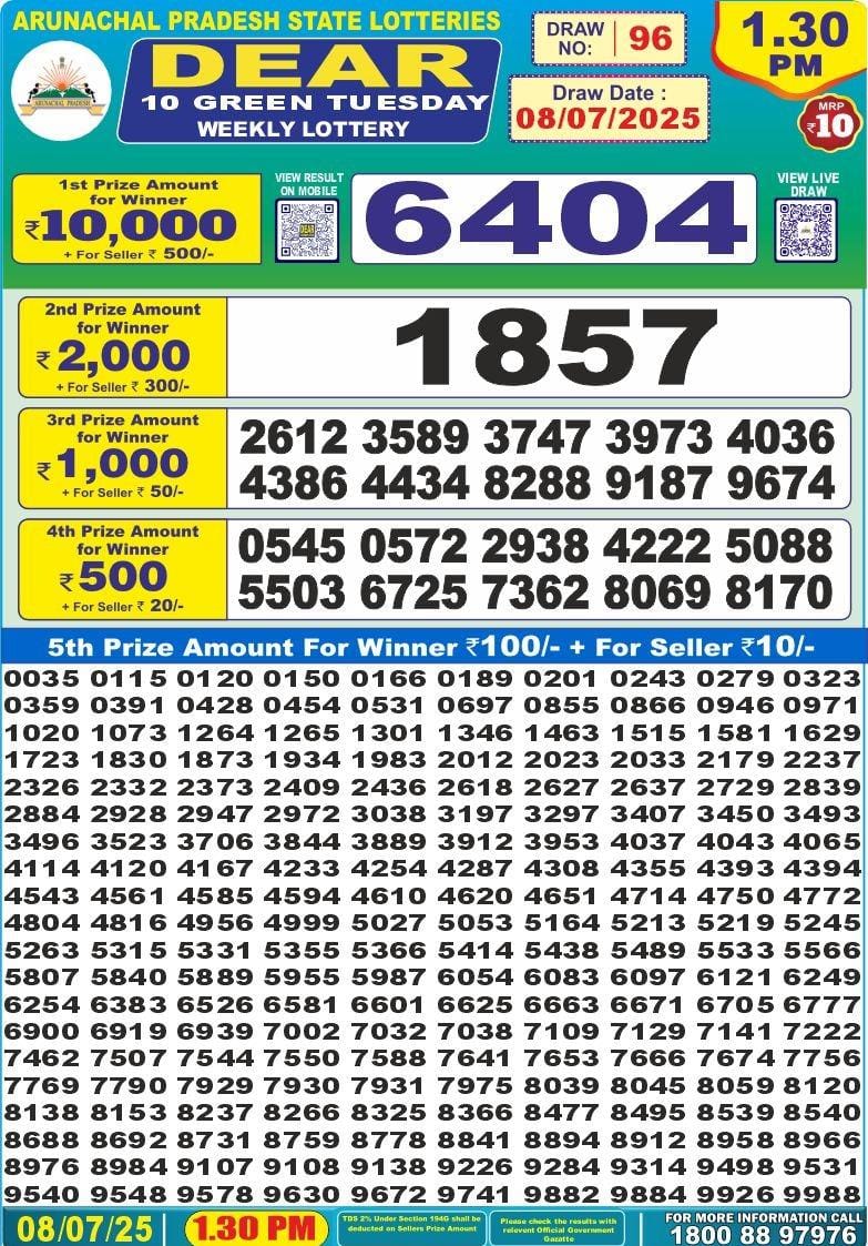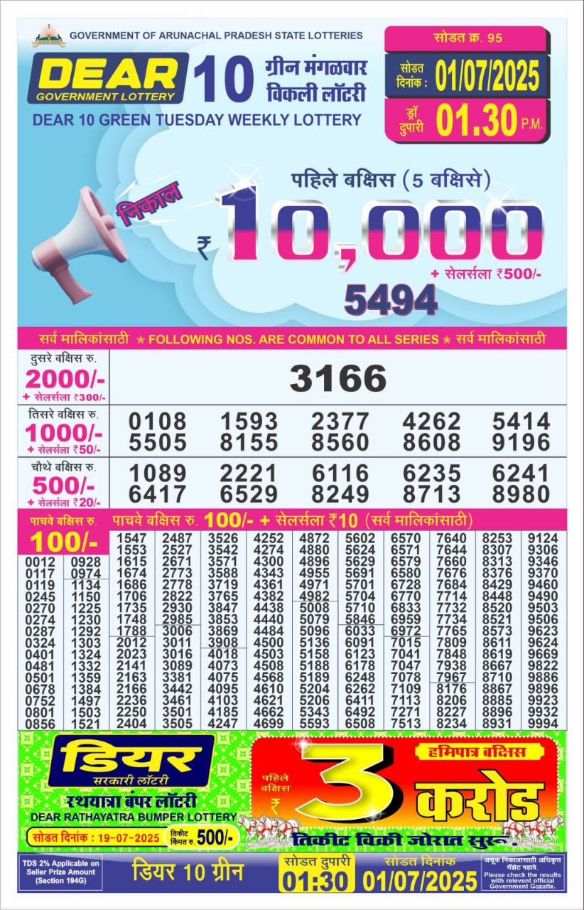 Dear 10 green tuesday weekly lottery 1:30 pm 15-7-25