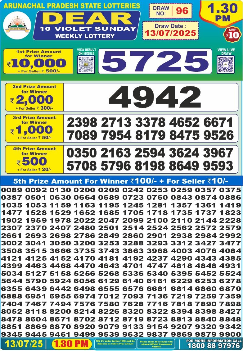 Dear 10 violet sunday weekly lottery 1:30 pm result 13-7-25