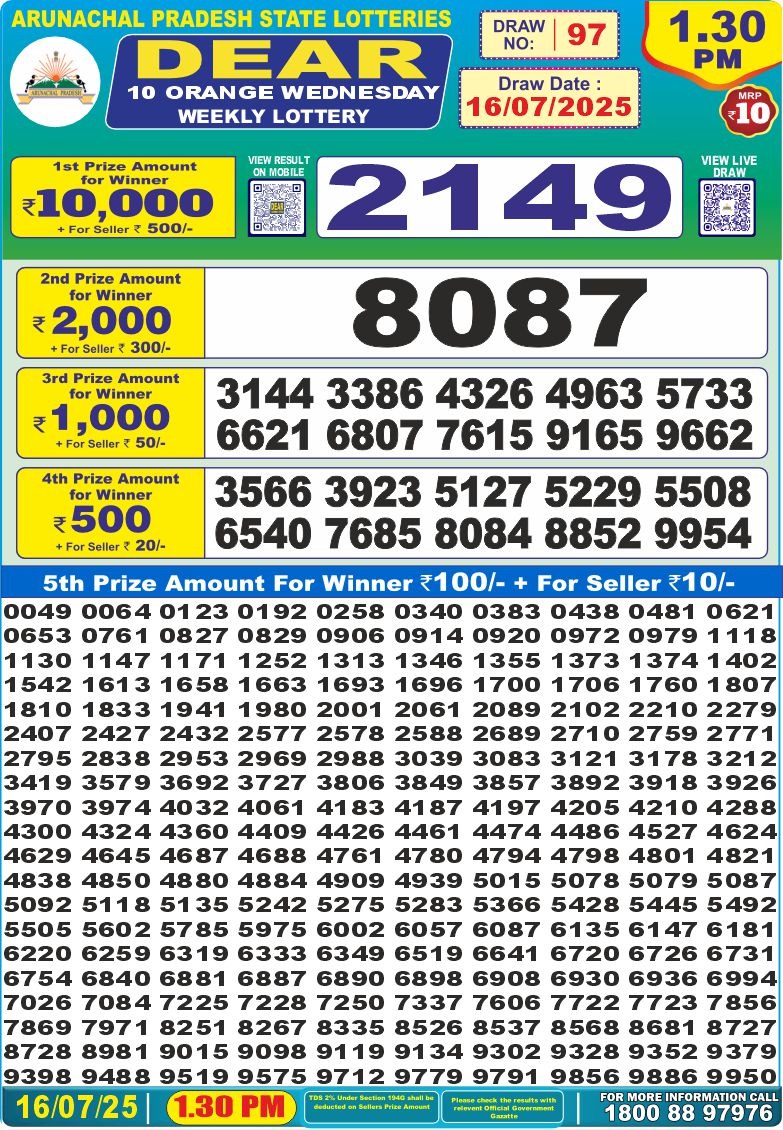 Dear 10 orange Wednesday weekly lottery 1:30 pm result 16-7-25