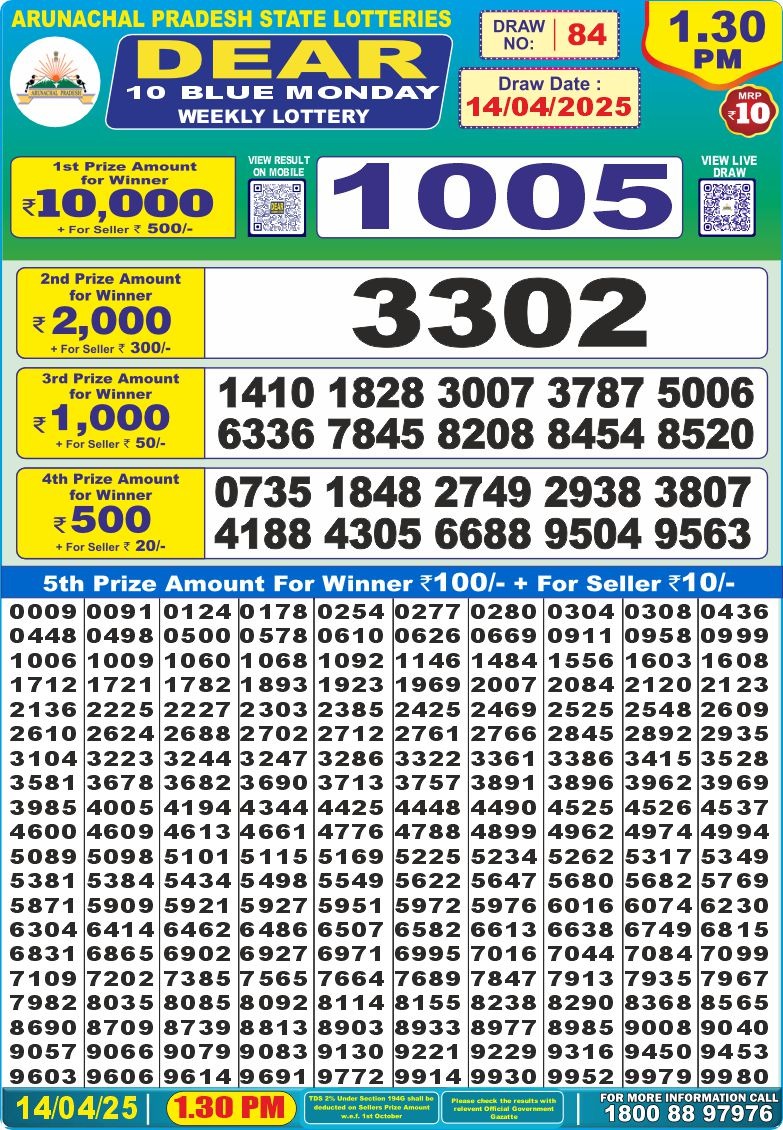 Dear 10 blue monday weekly lottery 1:30 pm result 14-4-25