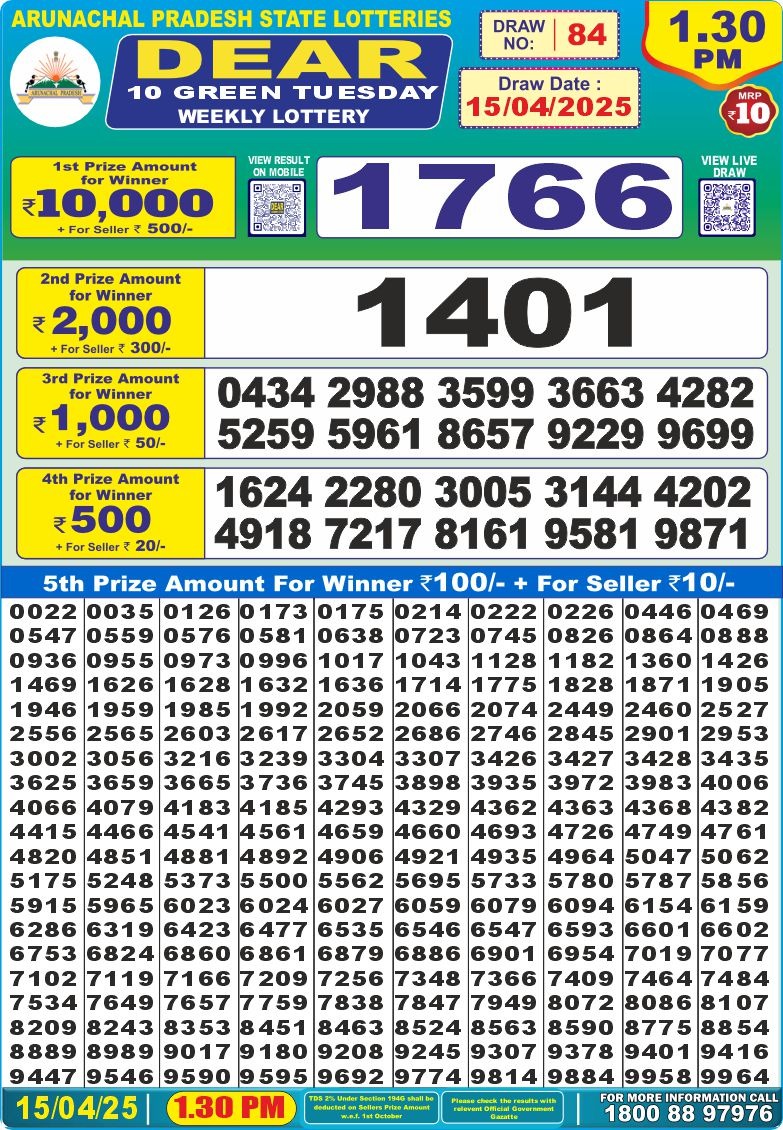 Dear 10 green tuesday weekly lottery 1:30 pm 15-4-25