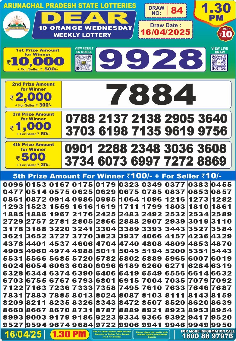 Dear 10 orange Wednesday weekly lottery 1:30 pm result 16-4-25