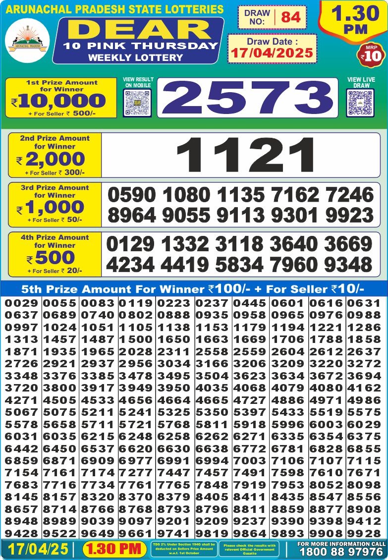 Dear 10 pink Thursday weekly lottery 1:30 pm result 17-4-25