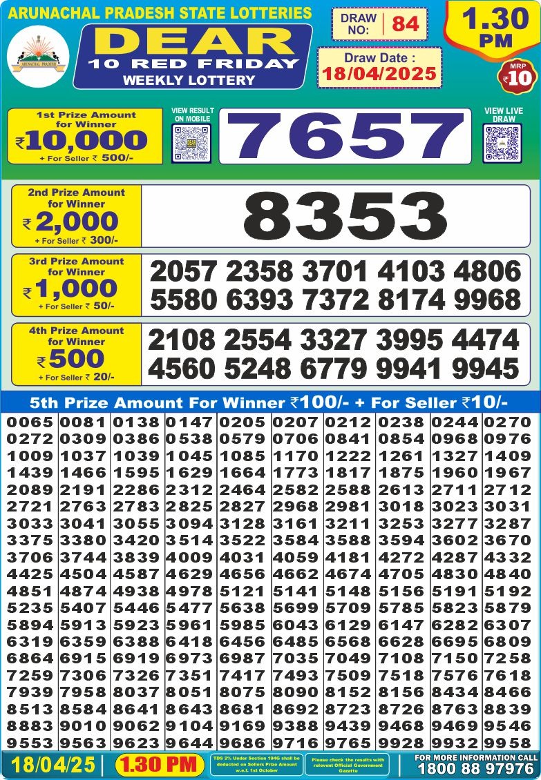 Dear 10 red friday weekly lottery 1:30 pm result 18-4-25