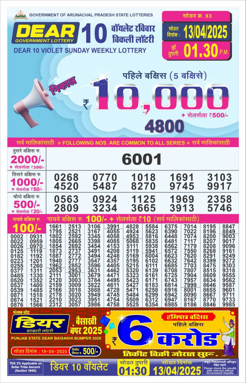 Dear 10 violet sunday weekly lottery 1:30 pm result 13-4-25