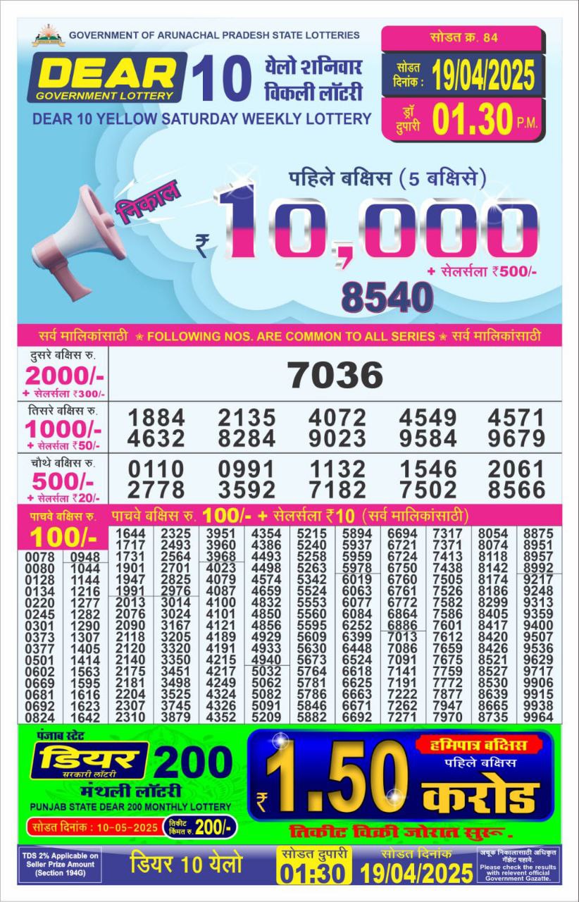 Dear 10 Yellow Saturday weekly lottery 1:30 pm result 19-4-25