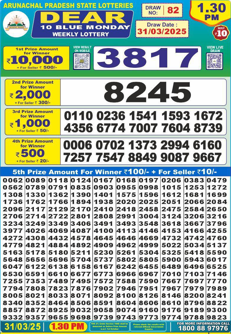 Dear 10 blue monday weekly lottery 1:30 pm result 17-3-25