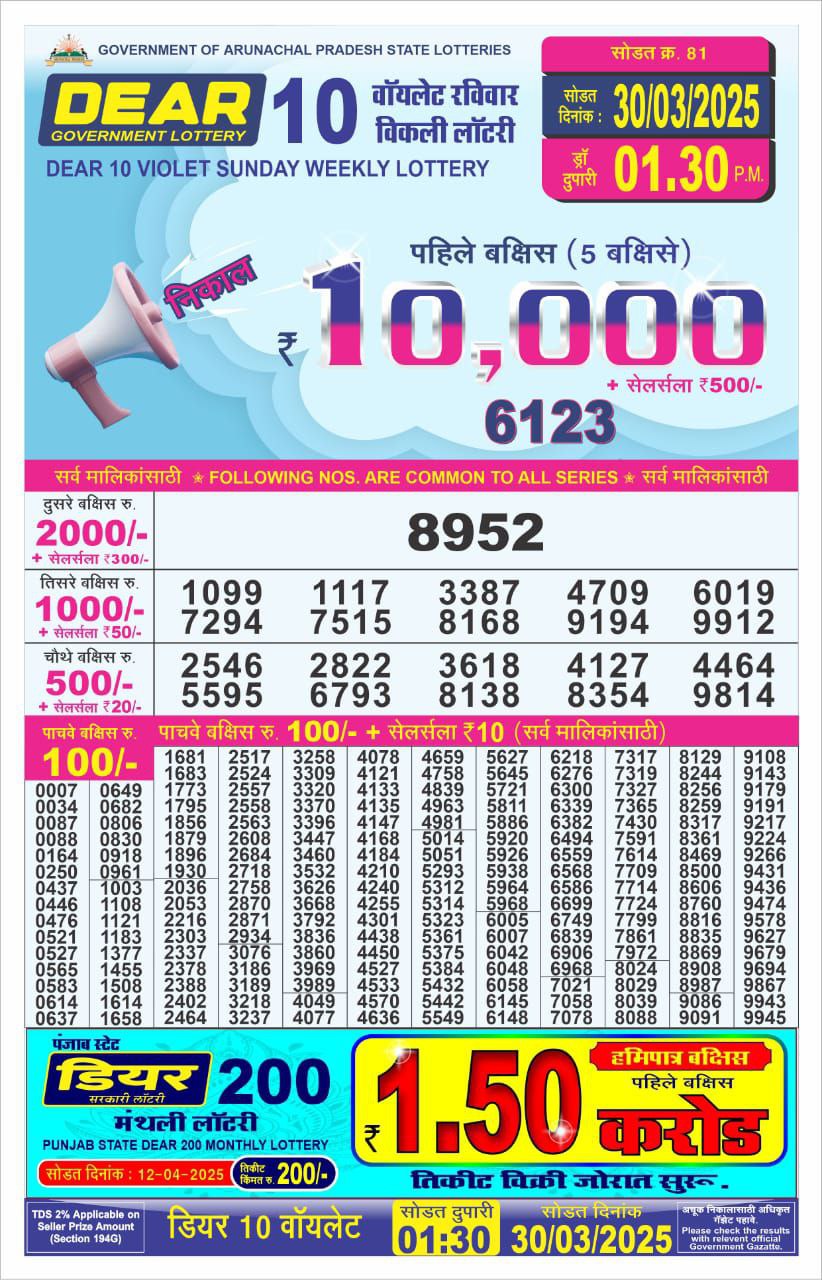 Dear 10 violet sunday weekly lottery 1:30 pm result 23-3-25