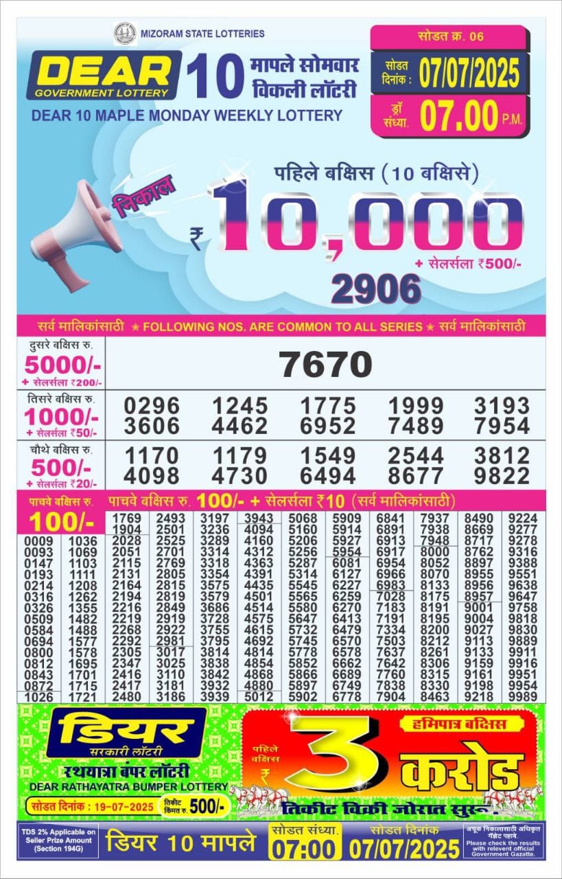 Dear 10 Maple monday weekly lottery 7 pm result 7-7-25