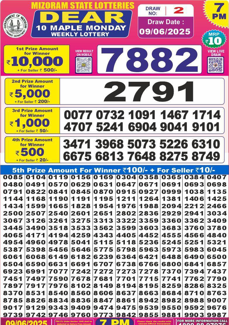 Dear 10 Maple monday weekly lottery 7 pm result 23-6-25