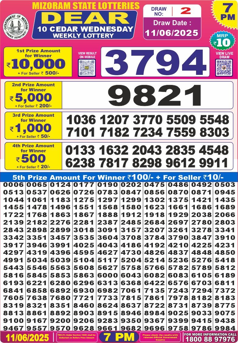 Dear 10 cedar wednesday weekly lottery 7 pm result 18-6-25