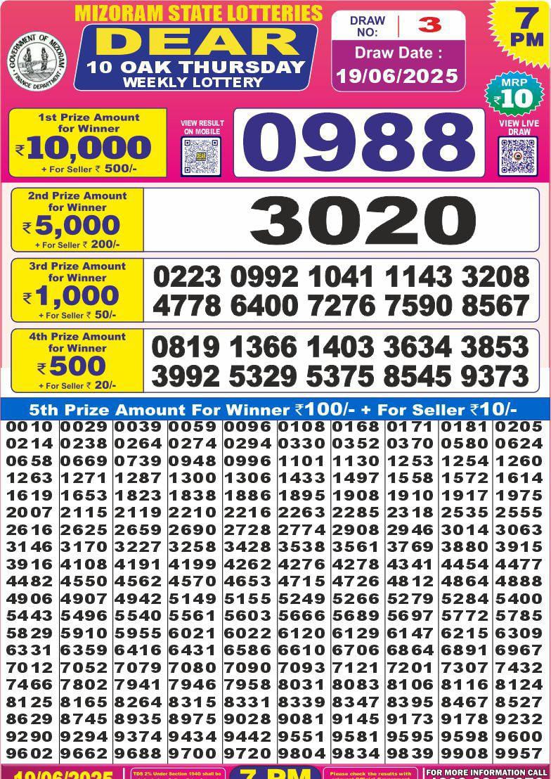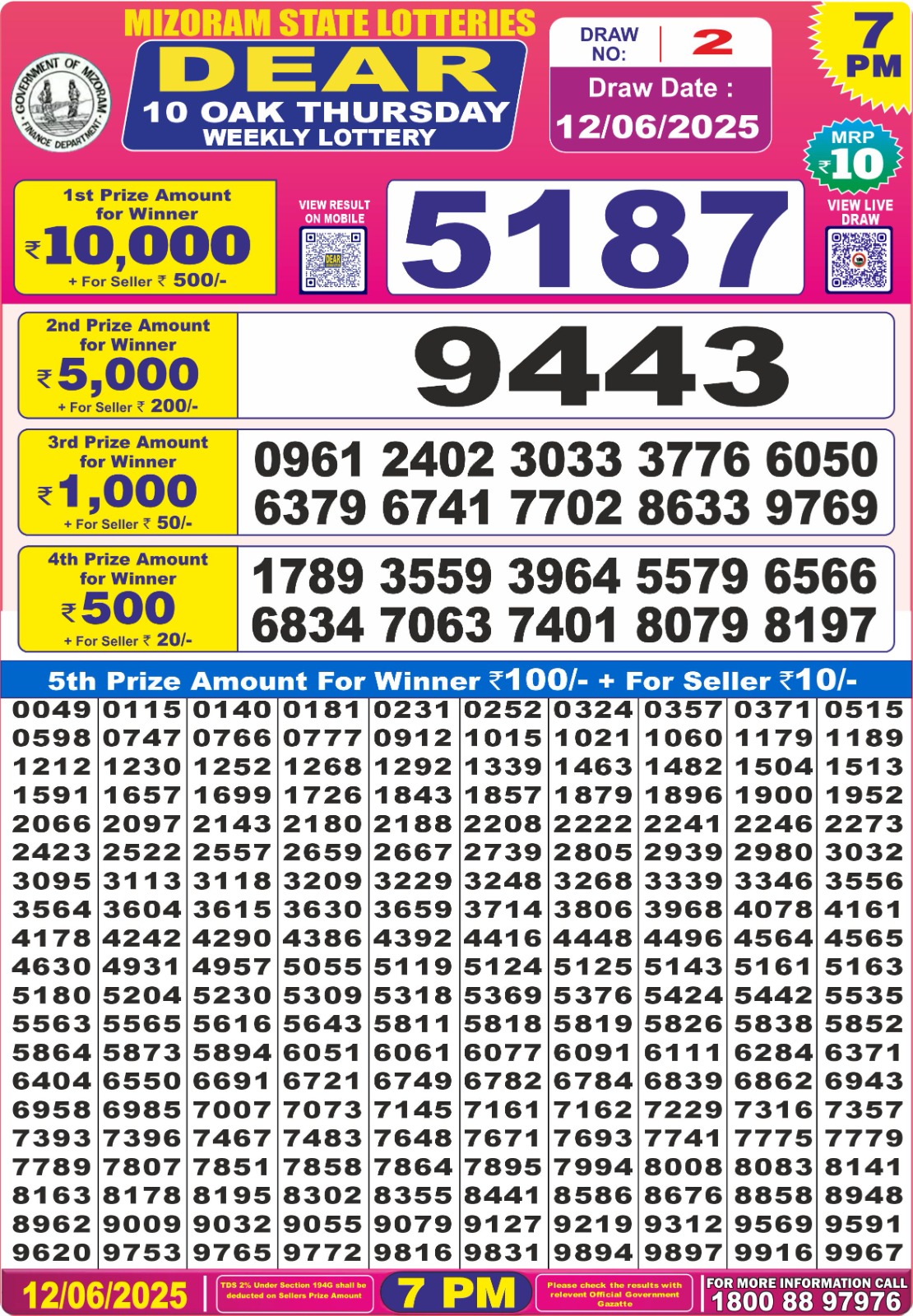 Dear 10 oak Thursday weekly lottery 7 pm result 19-6-25