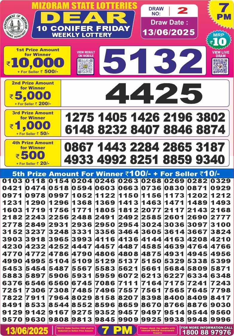 Dear 10 conifer  friday weekly lottery 7 pm result 13-6-25