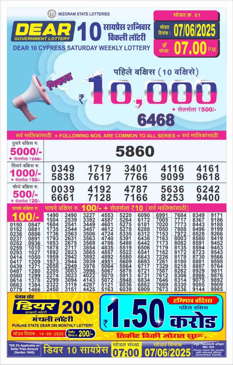 Dear 10 cypress saturday weekly lottery 7 pm result 21-6-25