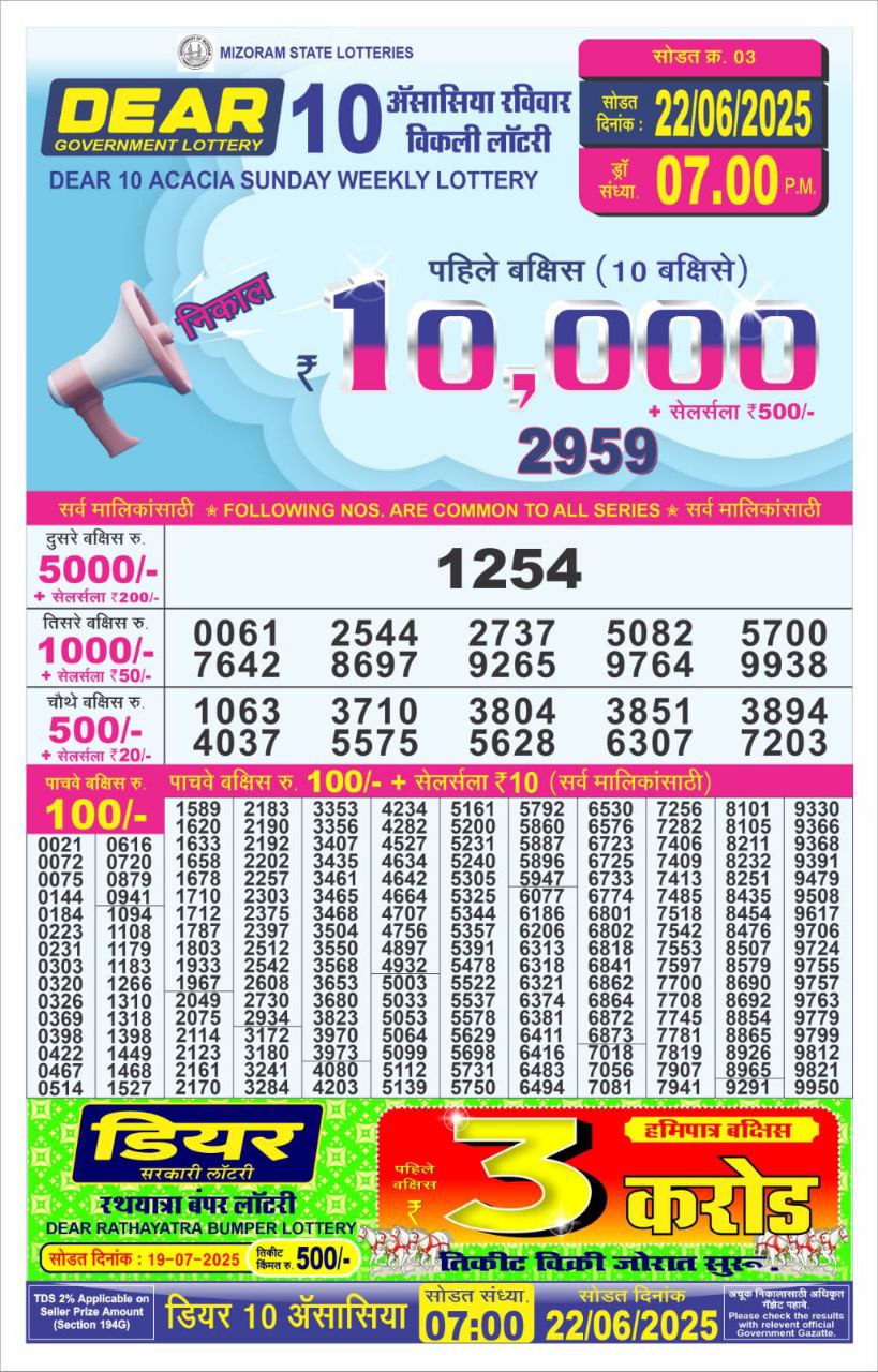 Dear 10 Acacia sunday weekly lottery 7 pm result 22-6-25