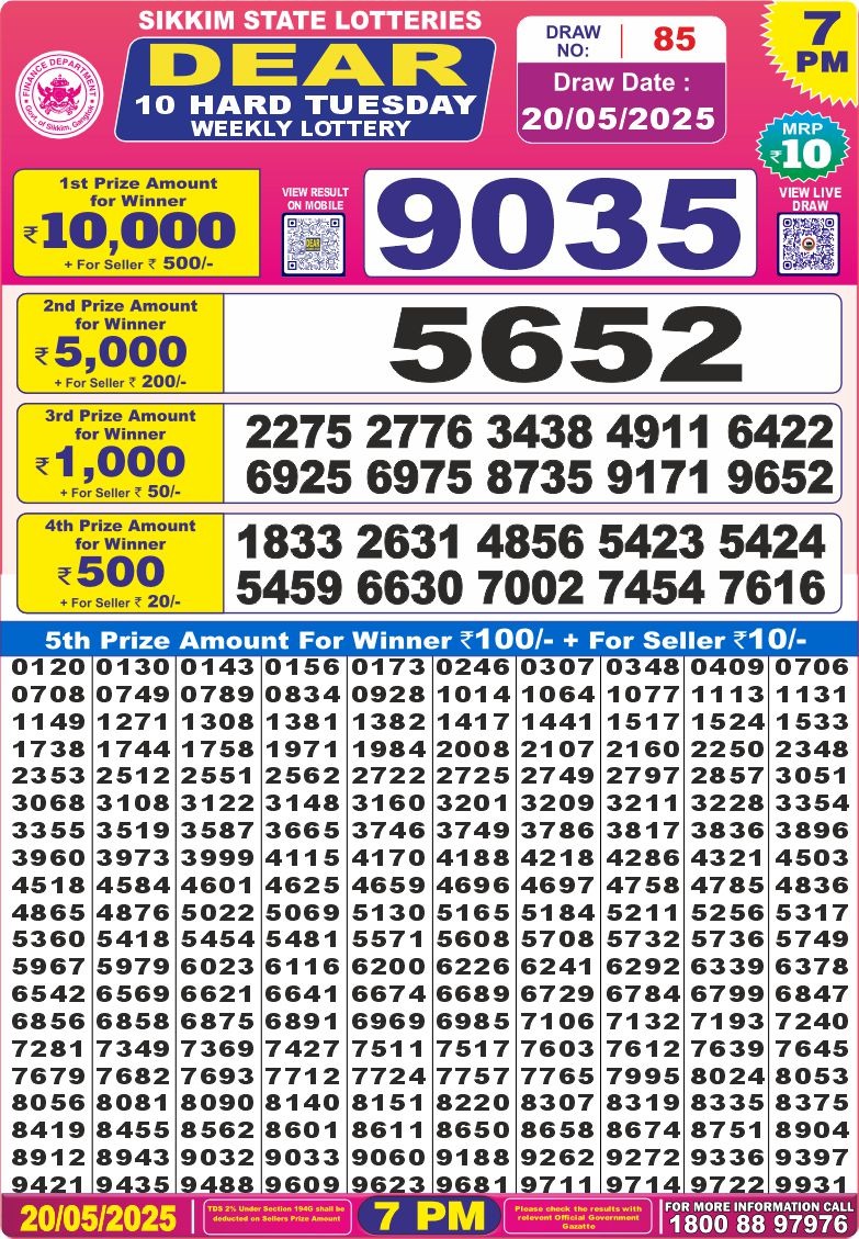 Dear 10 hard tuesday weekly lottery 7 pm result 20-5-25