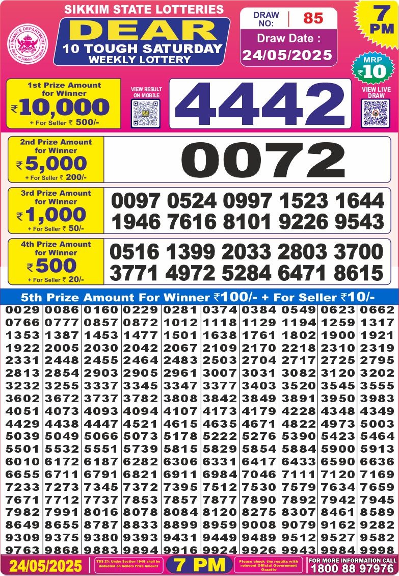 Dear 10 tough saturday weekly lottery 7 pm result 24-5-25