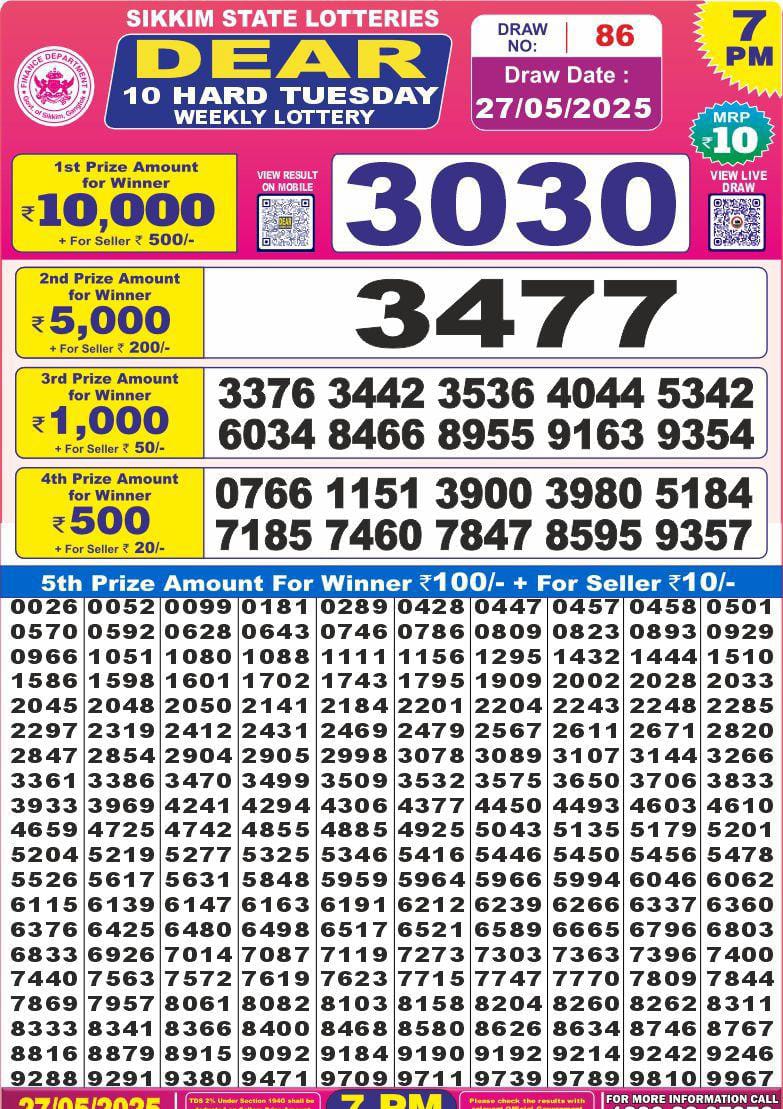 Dear 10 hard tuesday weekly lottery 7 pm result 27-5-25
