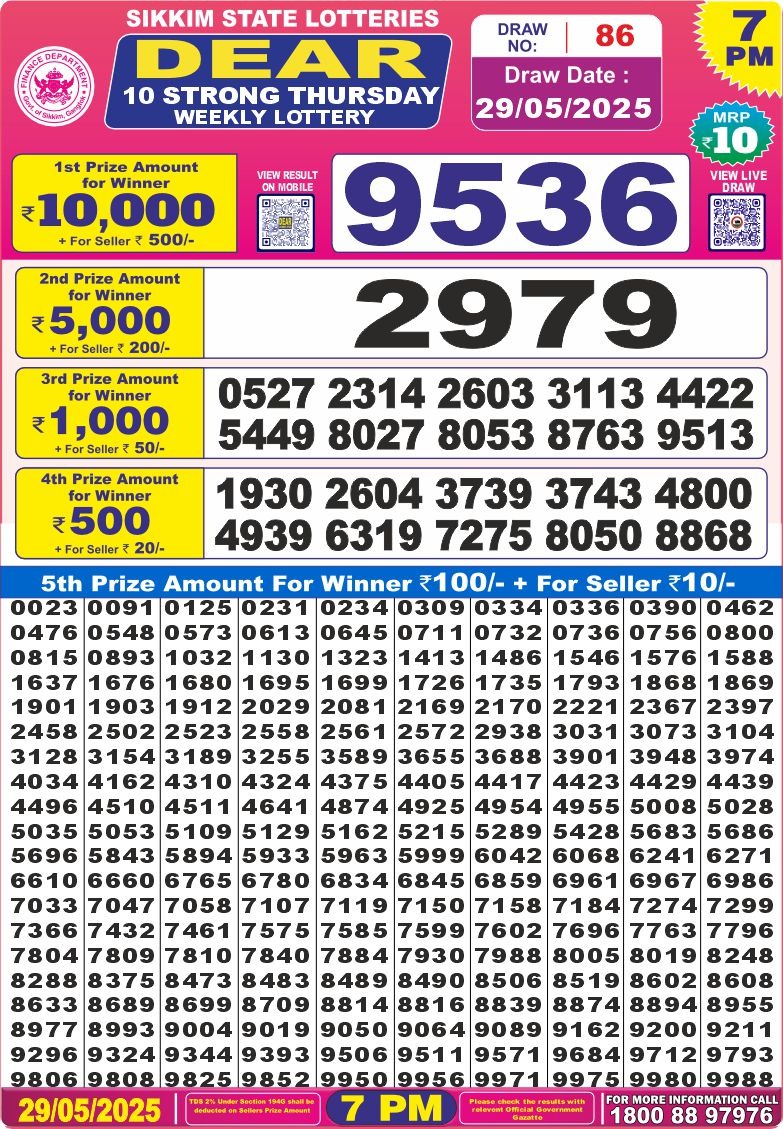 Dear 10 strong Thursday weekly lottery 7 pm result 29-5-25