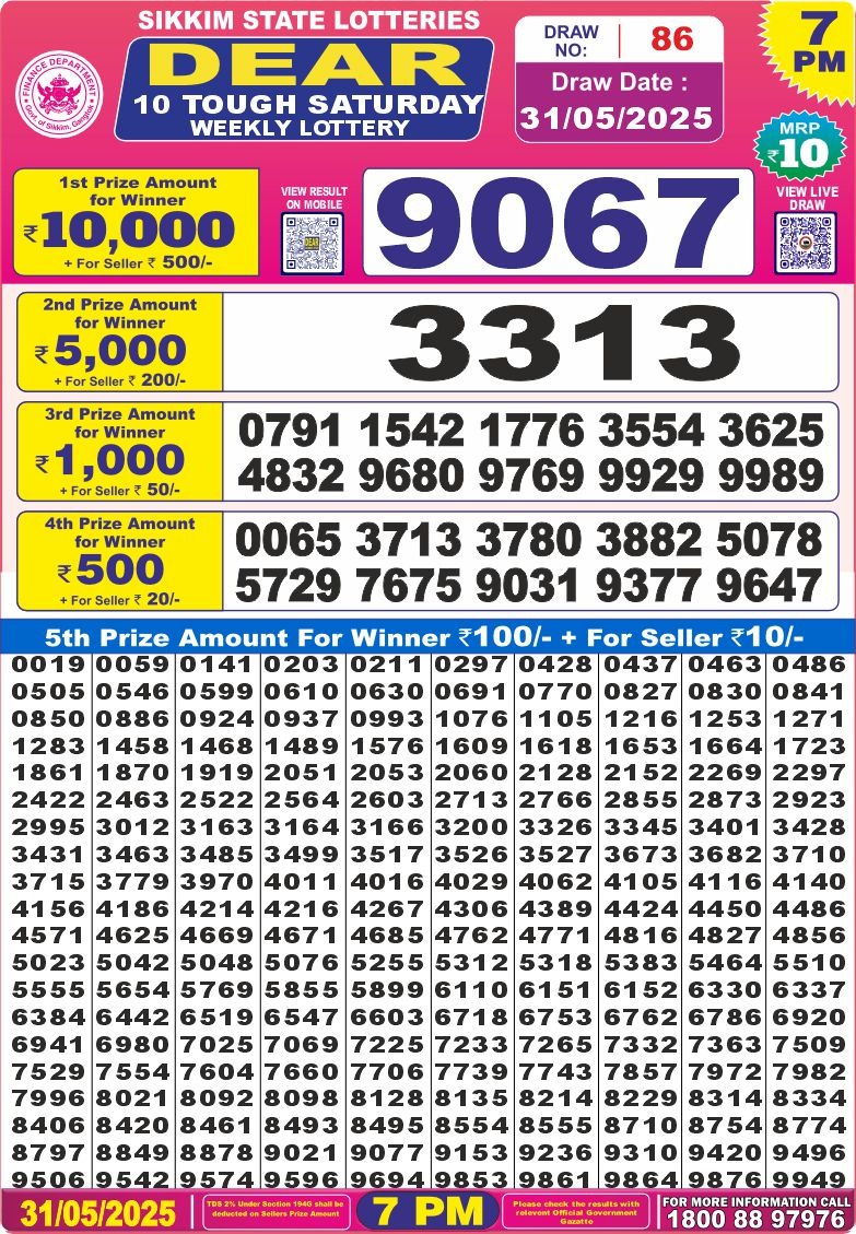 Dear 10 tough saturday weekly lottery 7 pm result 31-5-25