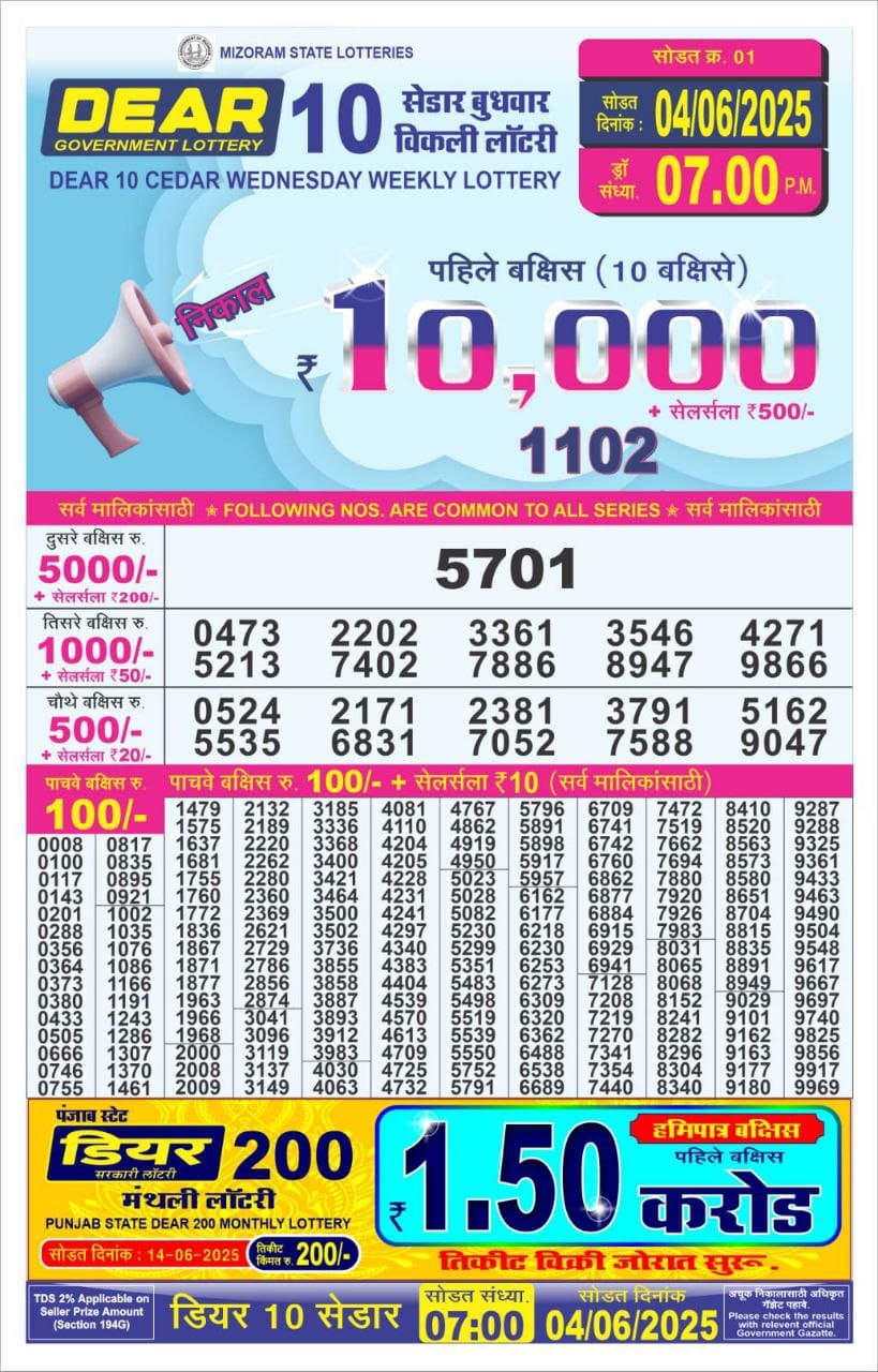 Dear 10 cedar wednesday weekly lottery 7 pm result 4-6-25