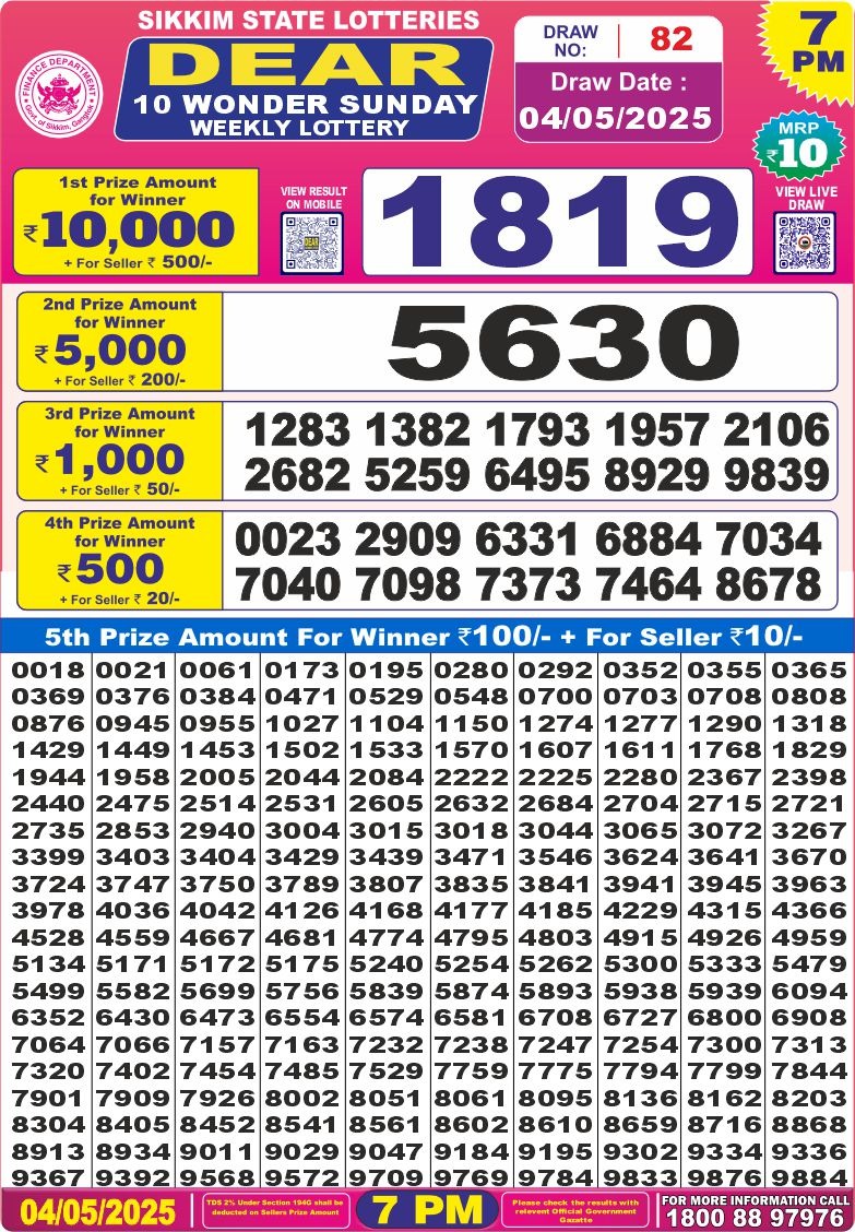 Dear 10 wonder sunday weekly lottery 7 pm result 4-5-25
