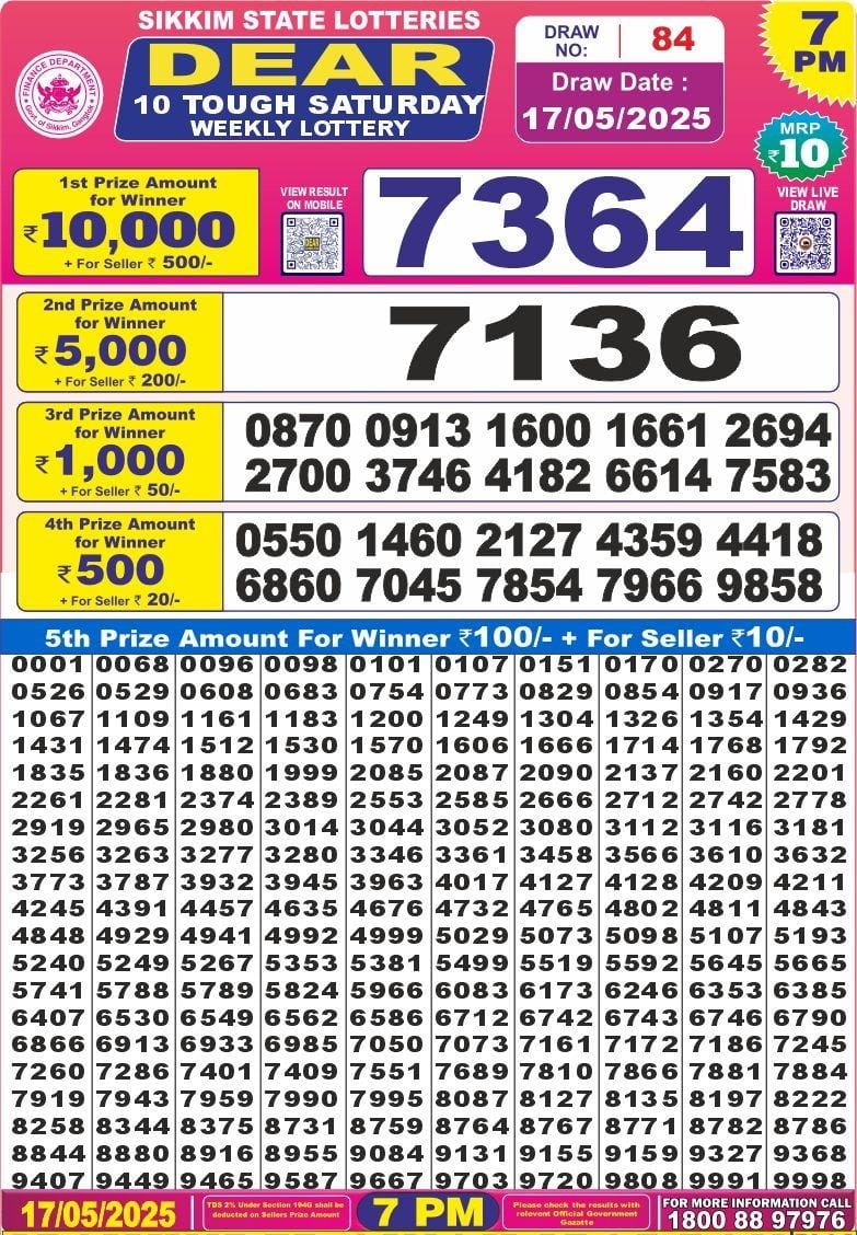 Dear 10 tough saturday weekly lottery 7 pm result 17-5-25