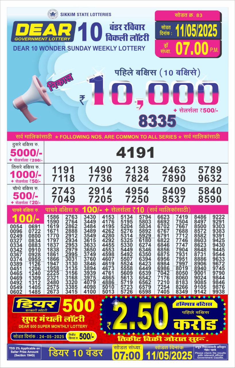 Dear 10 wonder sunday weekly lottery 7 pm result 18-5-25