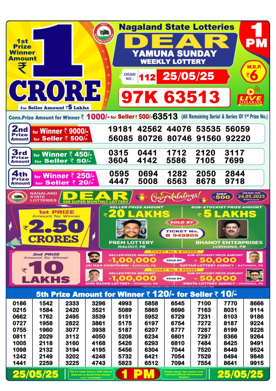 Dear yamuna sunday weekly lottery 1 pm result 25-5-25
