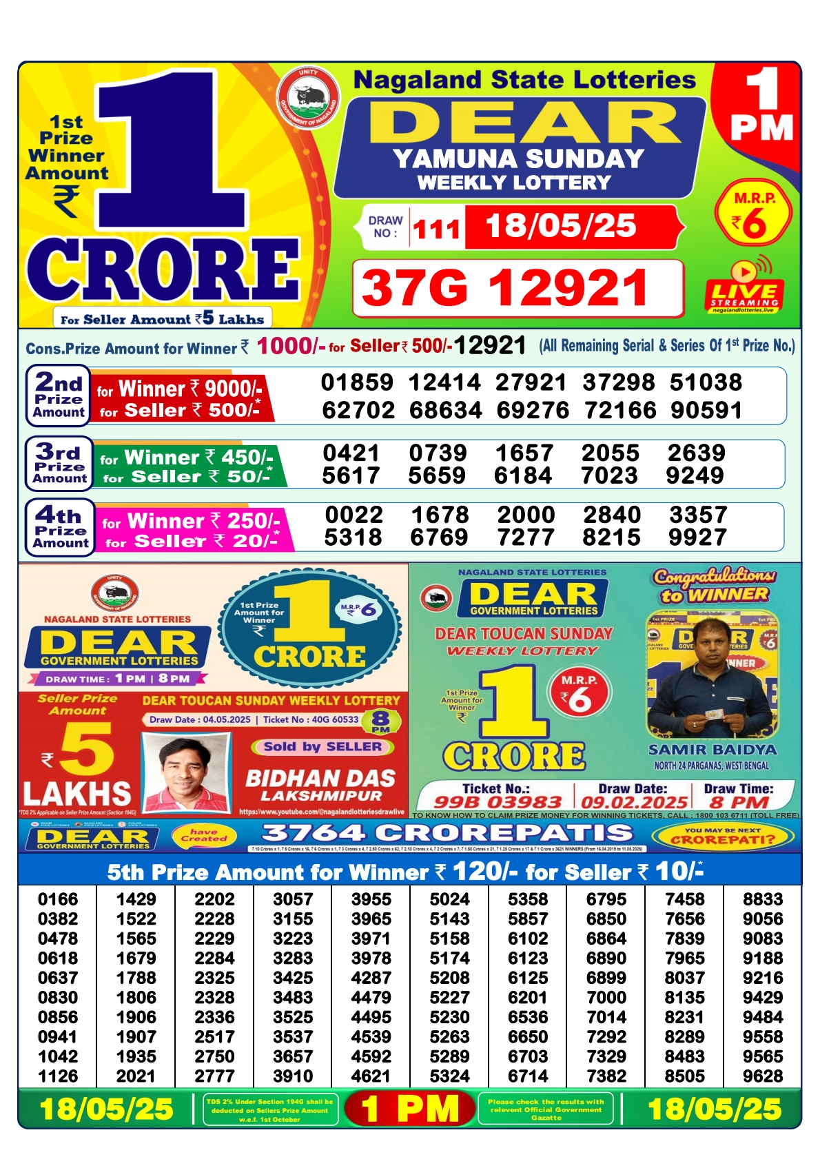 Dear yamuna sunday weekly lottery 1 pm result 18-5-25