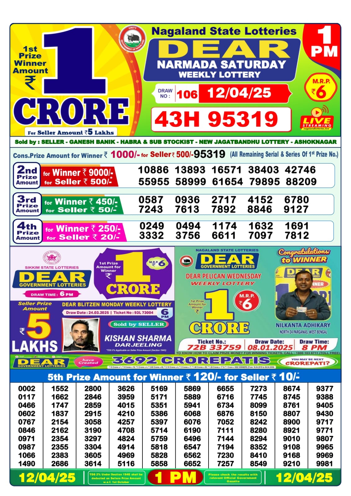 Dear narmada Saturday weekly lottery 1 pm result 12-4-25