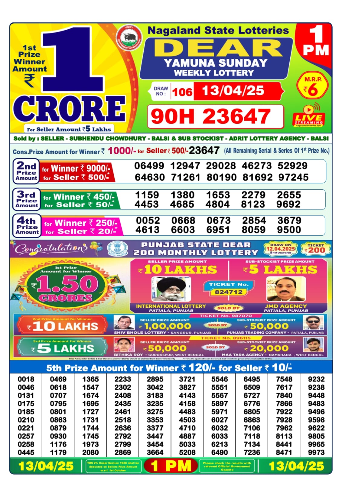 Dear yamuna sunday weekly lottery 1 pm result 13-4-25