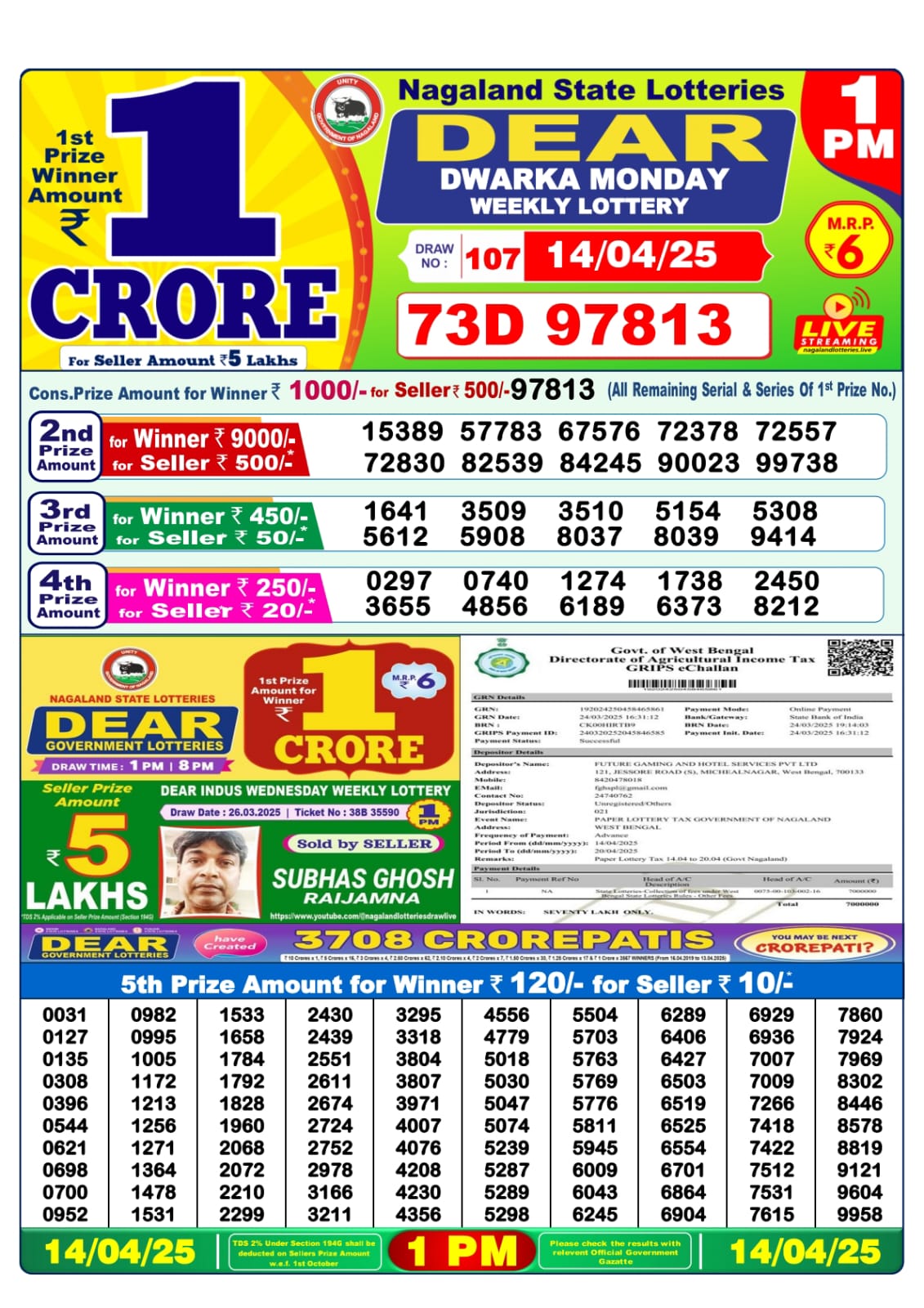 Dear dwarka monday weekly lottery 1 pm result 14-4-25