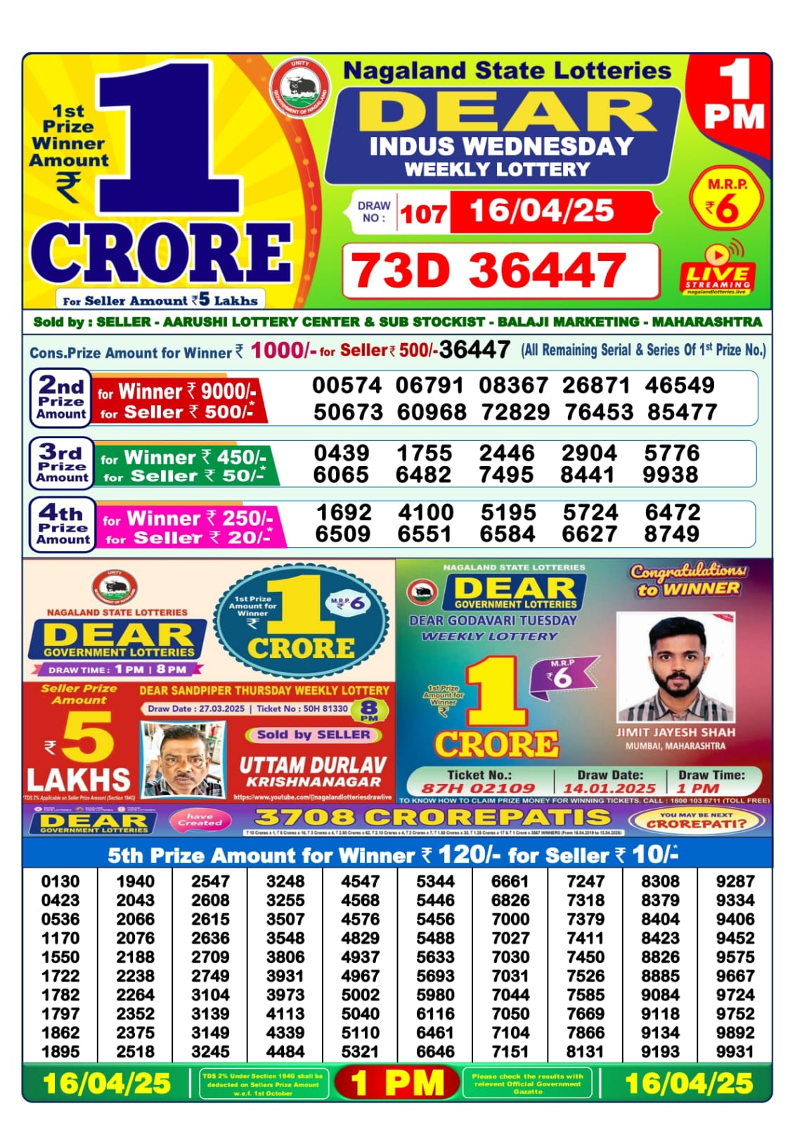 Dear indus wednesday weekly lottery 1 pm result 16-4-25