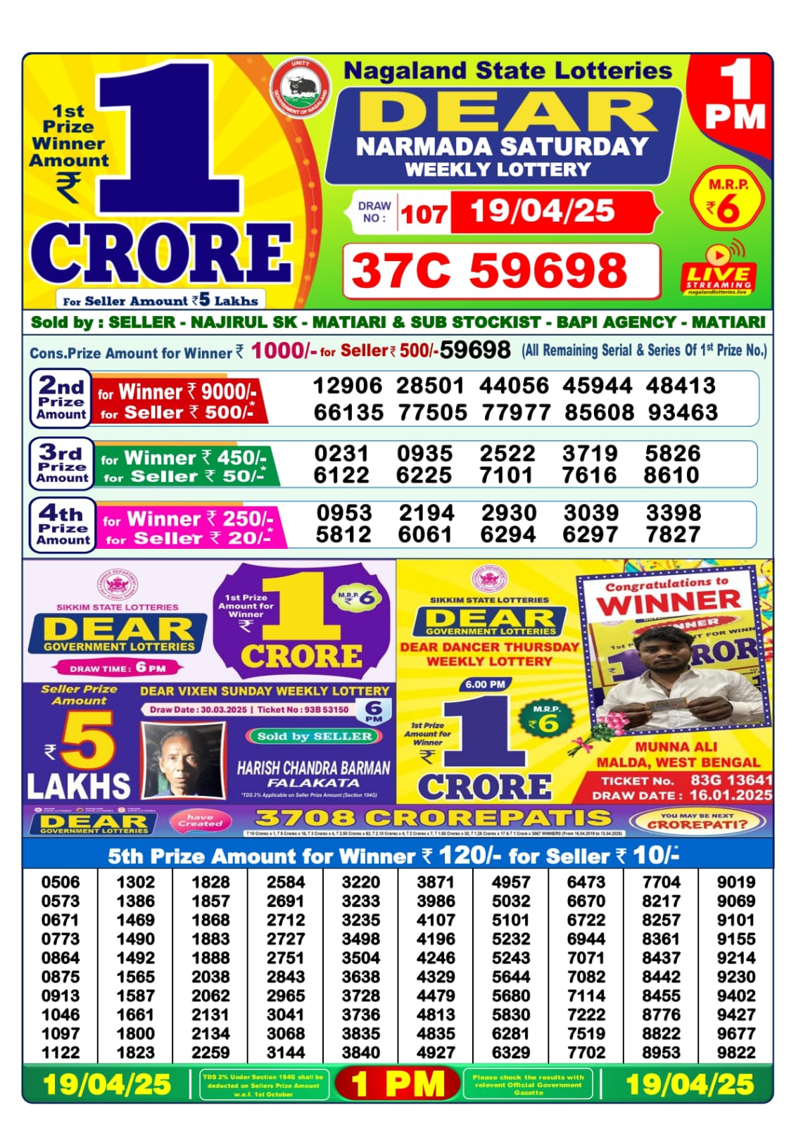 Dear narmada Saturday weekly lottery 1 pm result 19-4-25