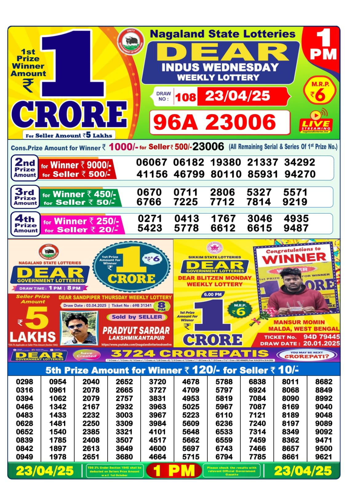 Dear indus wednesday weekly lottery 1 pm result 23-4-25