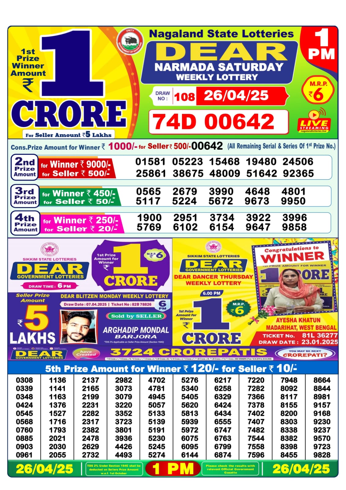 Dear narmada Saturday weekly lottery 1 pm result 26-4-25