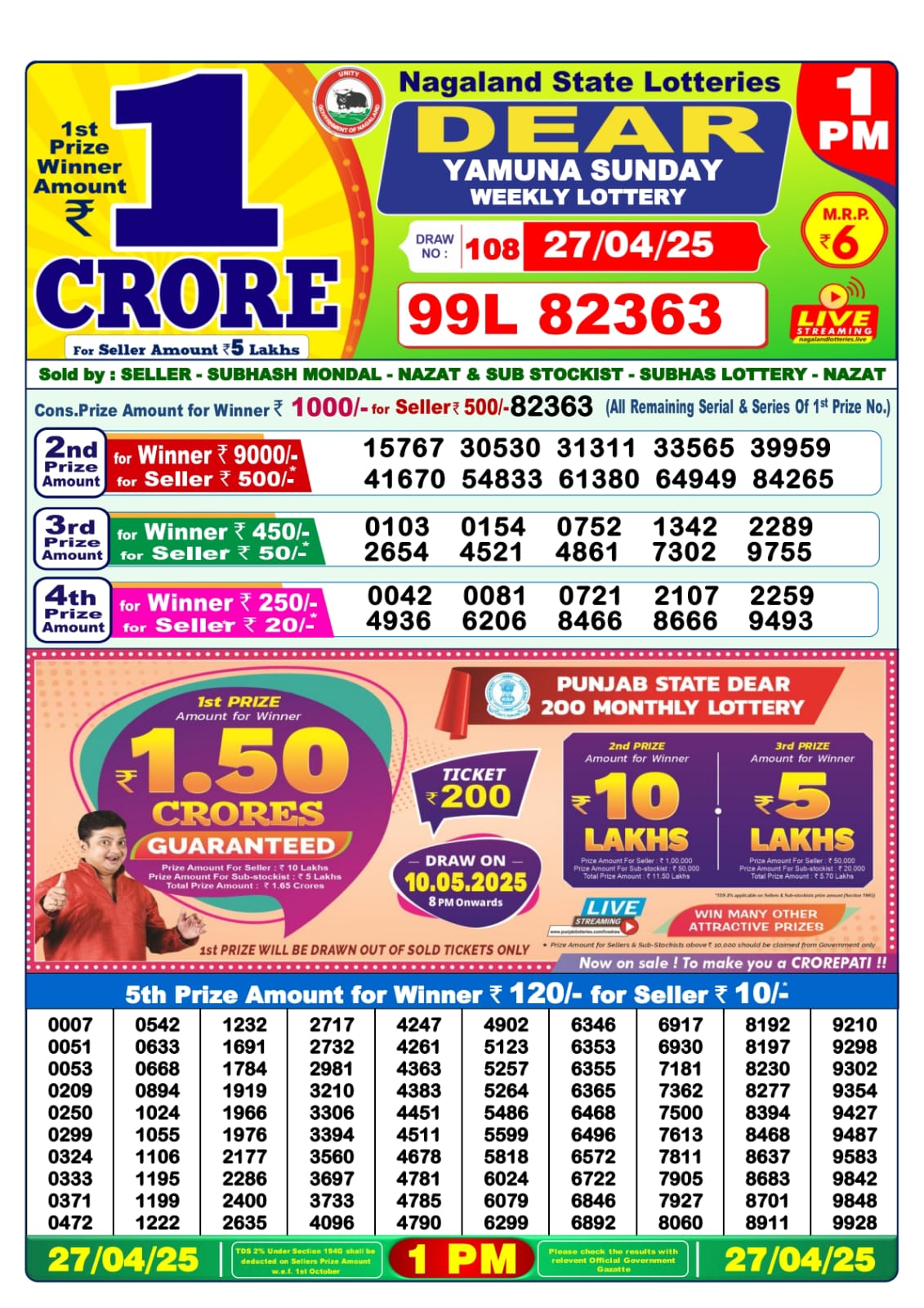 Dear yamuna sunday weekly lottery 1 pm result 27-4-25