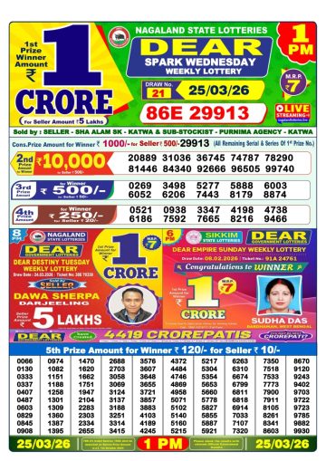 Dear Spark Wednesday Weekly Lottery 1pm Result 25-03-26